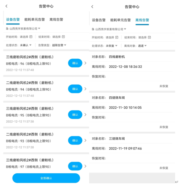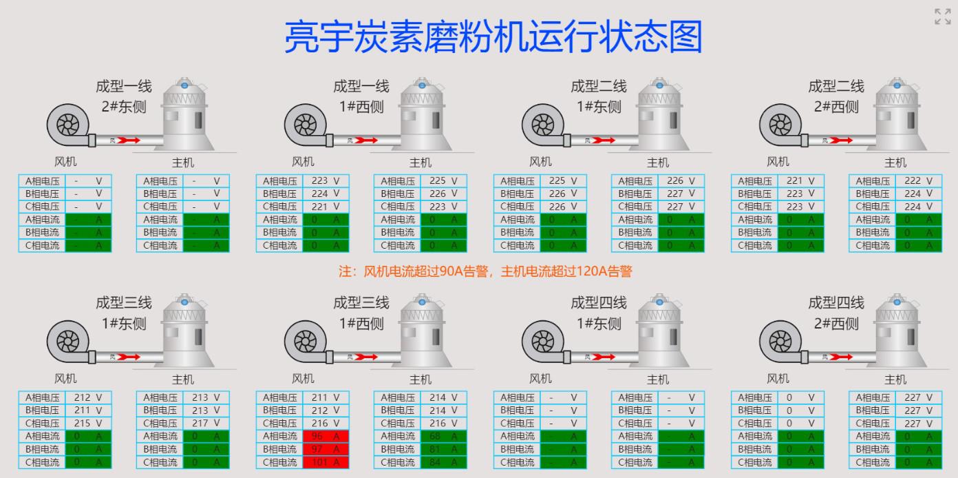 設備層面:建設對磨粉機設備的運行狀態的監測,通過對磨粉機電機的電壓電流監測,判斷設備的運行健康狀態,做到電機電流的越限報警。