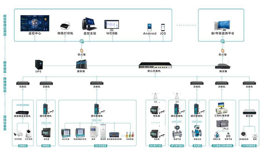 T@Energy智慧能源管理系統架構包括能效管理層、網絡通訊層、現場設備層三層架構。本方案結合網絡通訊、數據庫產品和技術建立一套先進的、符合非金屬礦物制品業管理應用功能的能源管理系統。