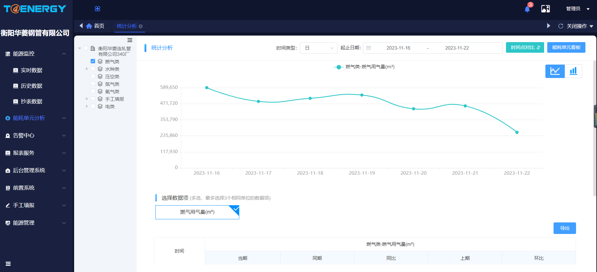 (2)班組能源消耗分析;按照早中晚班的運行統計規則,進行用電量、用水量、氮氣耗量、氧氣耗量、燃氣耗量、壓空耗量的班組能耗分析,可協助企業進行班組能效考核。